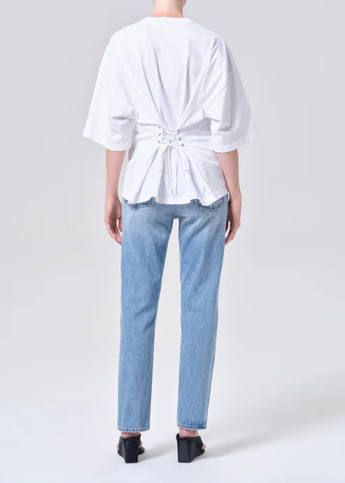 • DETAILS: The Romney Jean features a high-rise fit with a close-fitting top block and a quiet taper through the leg, cropped just above the ankle for a clean, elongating silhouette. Angled set-back pockets work with the high rise to create a naturally lifted effect through the back, giving this style a universally flattering shape. Rendered in a light vintage washed-out indigo, it is crafted from non stretch, weightless denim washed down for a super soft feel that drapes effortlessly while maintaining structure. Style it with a fitted tank and slides for an easy warm-weather uniform, or pair with a crisp shirt for a polished yet relaxed look.
