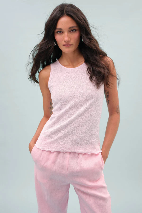 - DETAILS: Such a luxury: a sleeveless shell with flattering cutaway shoulders—in a floral jacquard fabric you’ll love. Delicate lettuce-edge trim adds an extra touch of romance.