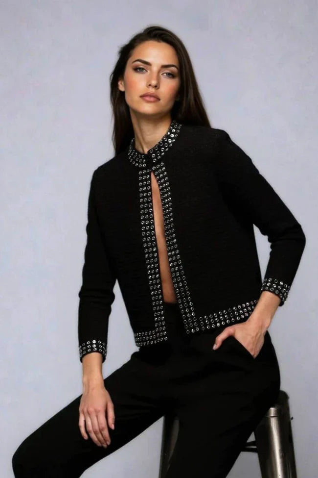 - DETAILS: This three-quarter sleeve jacket is textured, thick, and incredibly soft to the touch—designed to feel luxe and comfortable from the moment you slip it on. The rhinestone trim adds a refined hit of sparkle, giving the structured silhouette a touch of modern glam.