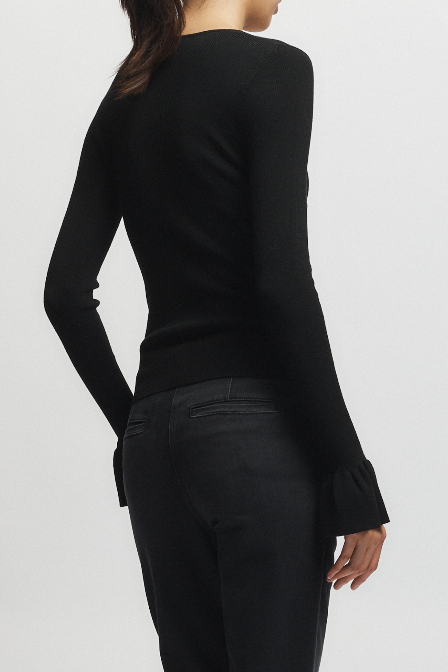 - DETAILS: Crafted from premium merino wool, the Watson Ruffle Knit Sweater in black offers a refined fit that contours the body elegantly. Its signature ruffle sleeves add a sophisticated, feminine detail, making it an ideal choice for both professional and upscale casual settings.