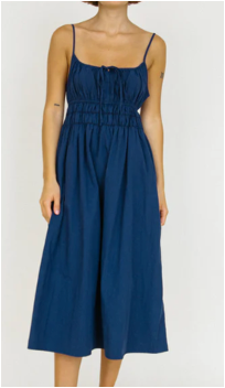 The Gabriela Dress is a cotton midi-length, spaghetti strap dress featuring 2 tiers of smocking under the bust and a keyhole tie at the bust. Straps are adjustable.