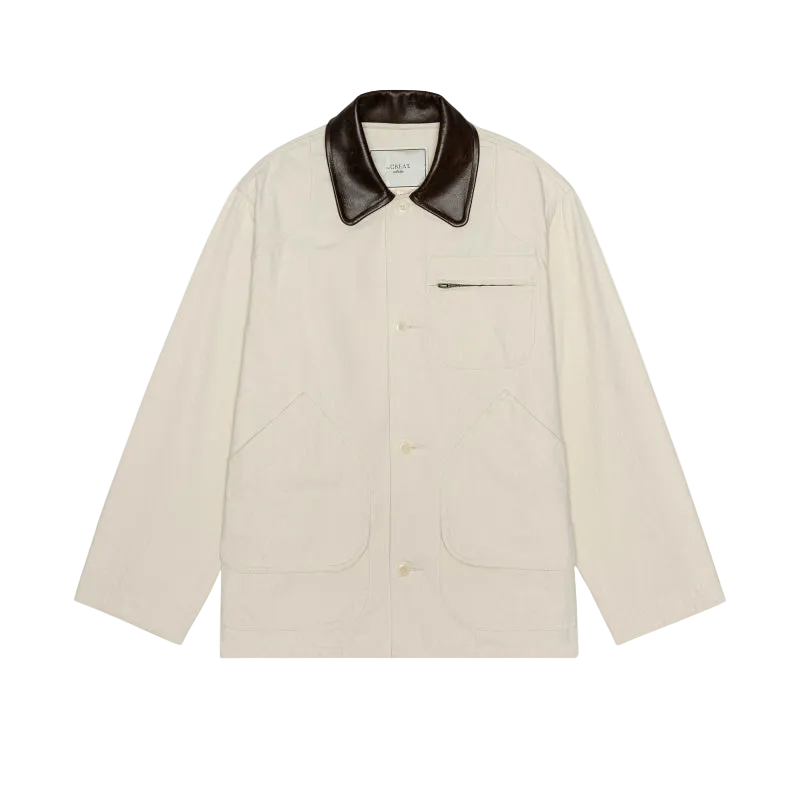- DETAILS: Our take on a heritage New England-style workwear jacket, designed with a relaxed fit. It features utility pockets, pleated vents at the back, and is made from garment-dyed cotton canvas. The contrast collar is crafted from genuine leather, and the jacket is finished with corozo buttons at the front placket and cuffs.