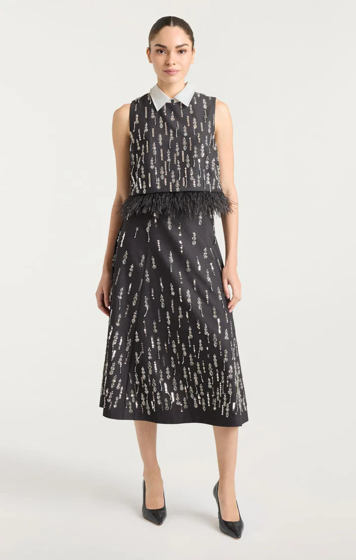 - DETAILS: The Selene Top features a sleek sleeveless collar style enhanced by a feather-trimmed hem for texture and movement. Adorned with sparkling sequins and delicate beadwork, this stylish top adds a glamorous finishing touch to your ensemble.