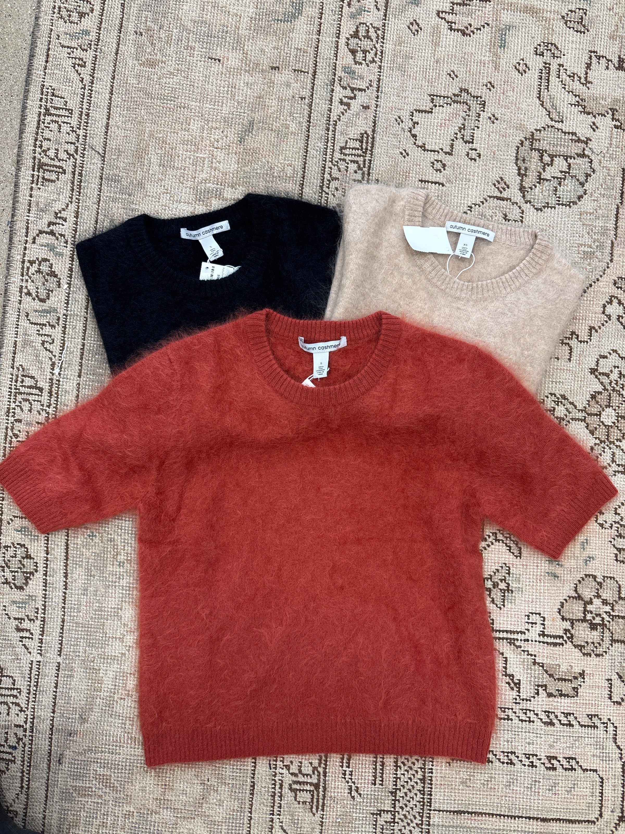 - DETAILS: Cropped short sleeve crew neck sweater with mohair