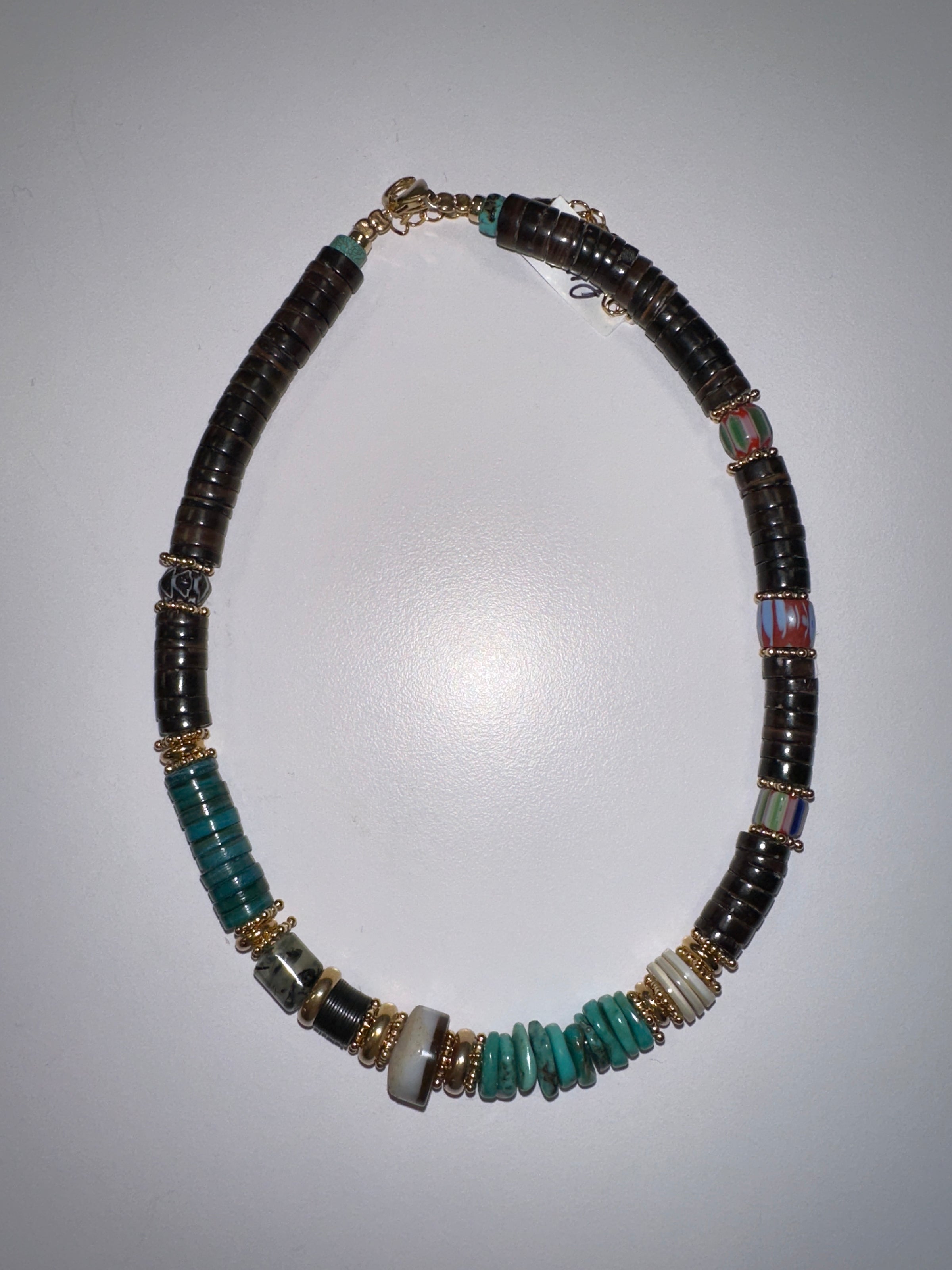 Shell short necklace, turquoises, vintage agate, citrine, bakelite, jasper, African vintage beads, gold-plated 18K.